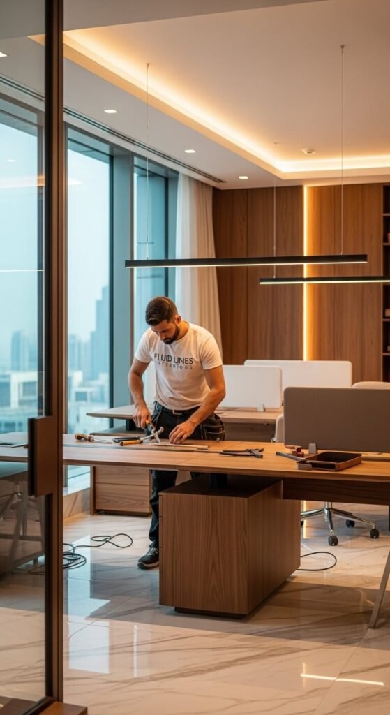 Enhance your workplace with professional carpentry and joinery services for offices in Dubai. Fluid Lines Interiors designs and fabricates functional wooden furniture that boosts productivity while reflecting your brand identity.