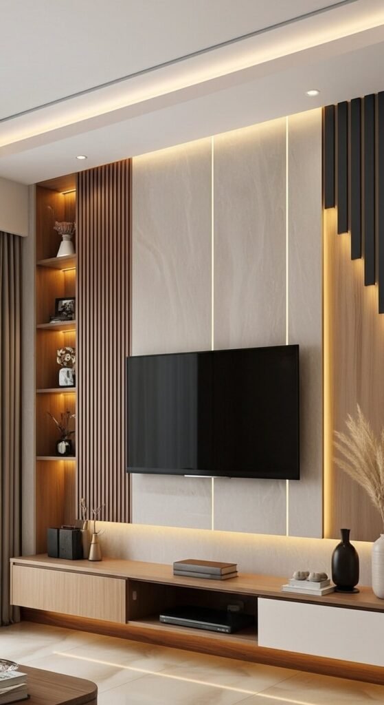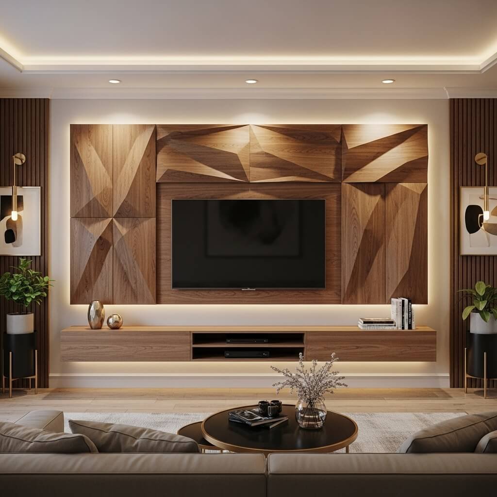Decorative wooden wall panels that frame your TV area with texture and elegance.