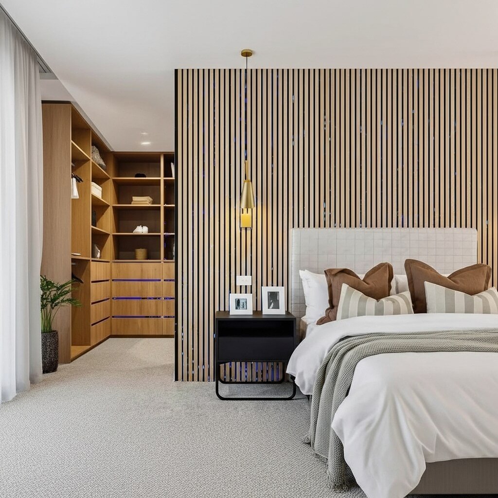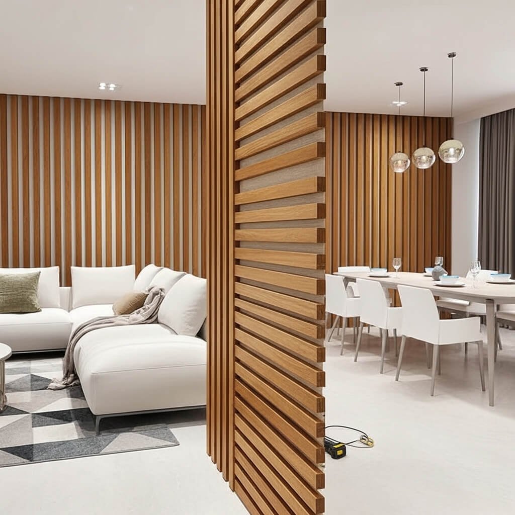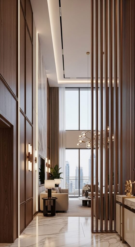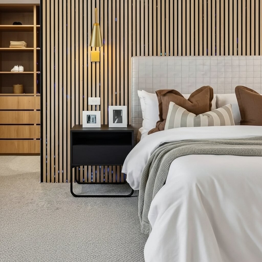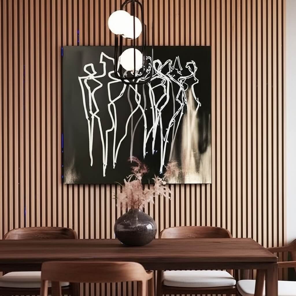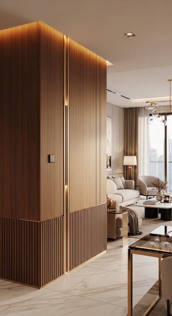 Experience elegant wooden wall installation in Dubai by Fluid Lines Interiors, offering refined wall panels, partitions, and bedback designs for homes, restaurants, offices, and contemporary business spaces.
